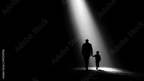 silhouettes of father and child walking together in darkness illuminated by dramatic beam of light symbolizing trust protection connection and emotional guidance