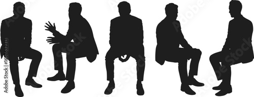 Silhouettes of five men seated in office chairs, engaged in business meeting, teamwork, collaboration, discussion, professional attire, isolated background..