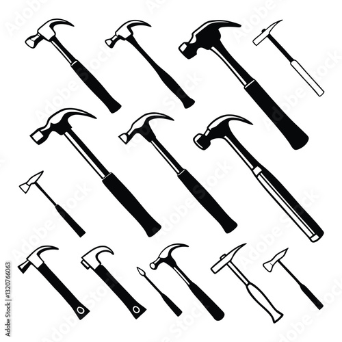 Silhouettes of Nine Different Hammers – Minimalist Tool Icons with Various Head and Handle Designs