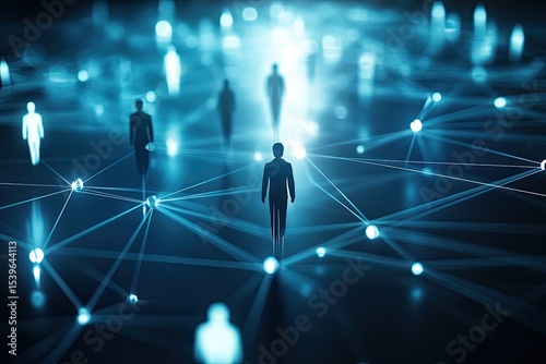 Silhouettes of people connected by a network of lines. A central figure stands out, surrounded by others. The backdrop is dark, with glowing, light-blue network lines and points