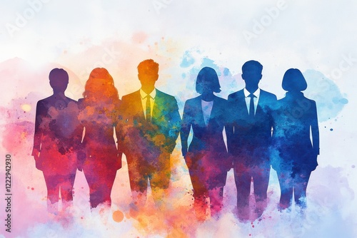 Silhouettes of professionals in suits, depicted in a colorful watercolor style, representing teamwork and collaboration.