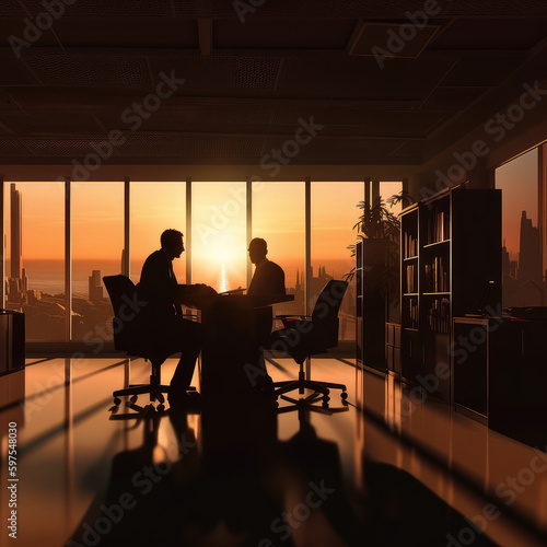 Silhouettes of two business people working sitting on armchairs in office interior, huge windows. Generative ai
