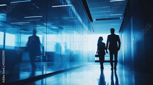 Silhouettes of Two People Walking in a Glass Hallway