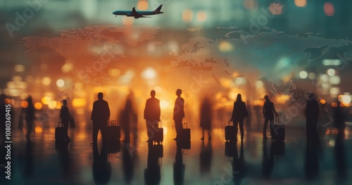 Silhouettes with Airplane Over World Map Background