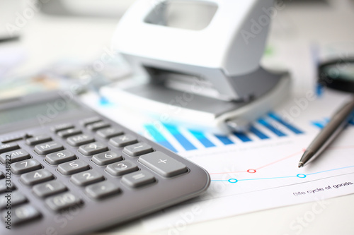 Silver calculator and financial statistics on clipboard pad at office table closeup. Internal Revenue Service inspector sum check irs investigation earnings savings loan and credit concept