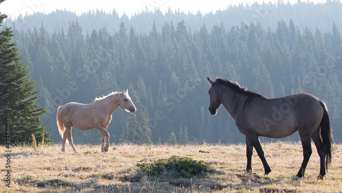 Silver Gray Grullo Stallion in front of Palomino Stallion in the Pryor Mountains Wild Horse Range in Montana United States