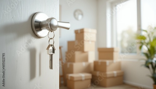 silver key inserted in door lock with blurred moving boxes in bright modern room