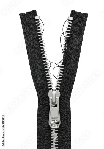 Silver metal zipper with black fabric, one side ripped exposing stitching holes and torn fibers, isolated on a transparent background with no shadows, high angle macro. Concept of detailed