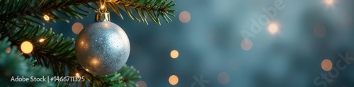 Silver orb hangs amidst sparkling Christmas branches , glitter, sparkle