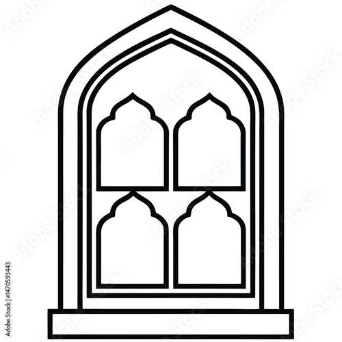 Simple black line art displays a window featuring four arch designs