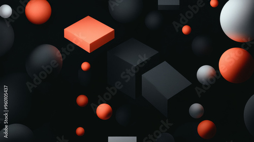 Simple geometric shapes, like cubes and spheres, are shown in a 3D design against a black background.
