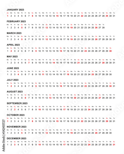 Simple horizontal calendar template year 2023