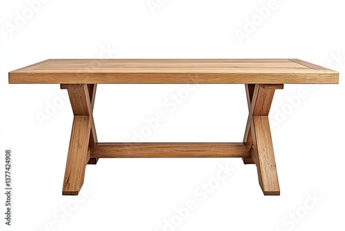 Simple, light brown wooden dining table with a rectangular top and X-shaped base