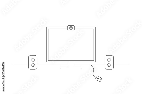Simple line art drawing of a computer monitor on a desktop, vector illustration