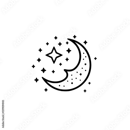 Simple Line Art Moon and Stars Icon on White, Minimalist Design