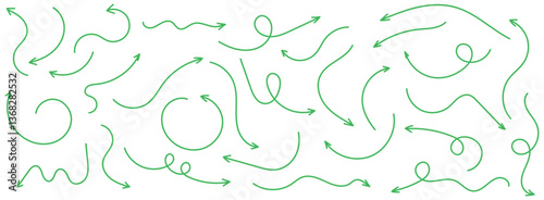 Simple lines, hand-drawn green arrows set in various styles. Hand-drawn curved, doodle, and zigzag arrow collection.