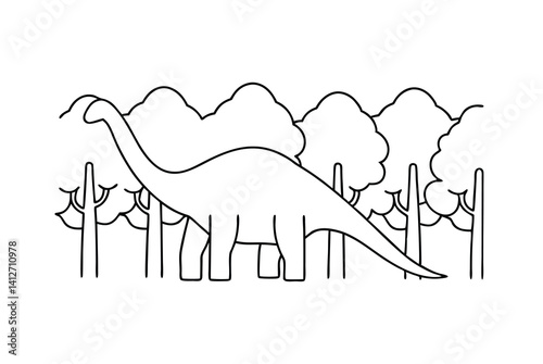Simple Outline Illustration Of A Brontosaurus Dinosaur Surrounded By Trees