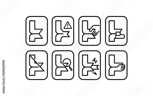 simple outline stroke icon 8 different each item inside rounded rectangle safety placard border no shadows no gradients plough notch hazard broken plough notch warning plough notch pinch