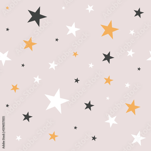 Simple seamless pattern with yellow, black, and white stars on soft background. Minimalistic and modern design for wallpapers, fabrics, and festive decoration.