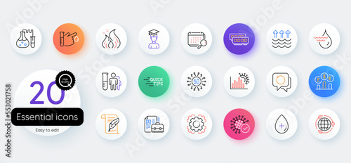 Simple set of Hydroelectricity, Recovery data and Eco energy line icons. Include Oil serum, Calendar, Blood donation icons. 5g technology, Fire energy, Medical analyzes web elements. Vector