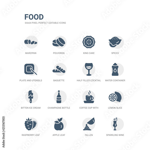 simple set of icons such as sparkling wine, fallen, apple leaf, raspberry leaf, lemon slice, coffee cup with steam, champagne bottle, bitten ice cream, water container, half filled cocktail glass.