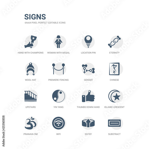 simple set of icons such as substract, entry, wifi, pranava om, islamic crescent with small star, thumbs down hand, yin yang, upstairs, chinese, gender. related signs icons collection. editable