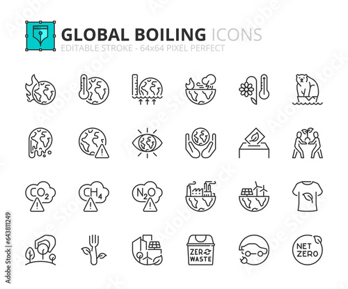 Simple set of outline icons about era of global boiling