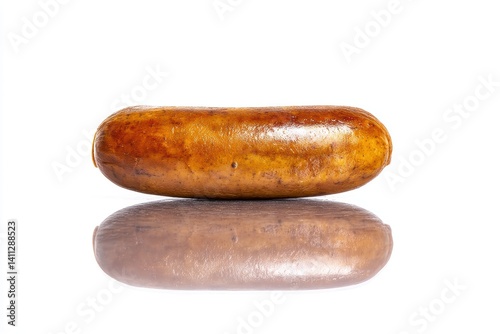Simple smoked sausage presentation on white table surface creating soft reflections in studio setup