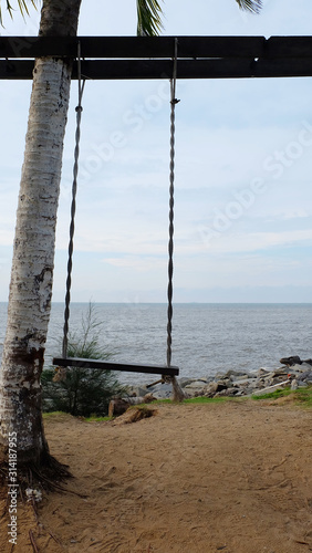 Simple swing by a coconut tree trunk, at the beach, looking out to the sea.