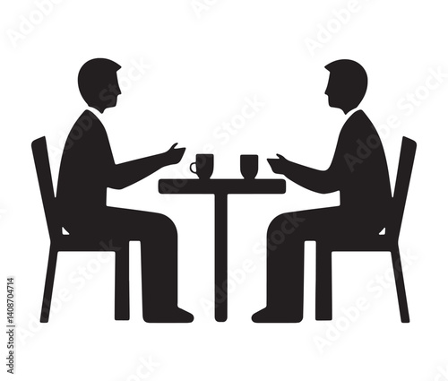 Simple vector icon of two people sitting at a table. Silhouette conversation business or coffee table talk illustration.