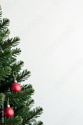 Simple white background with a small Christmas wreath in the corner, minimalist, cozy