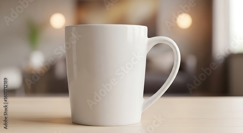 Simple white mug sits centered on a wooden table in a softly blurred interior.