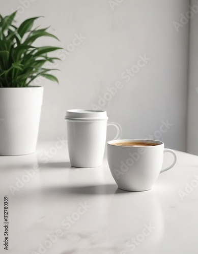 Simple white surface with a minimalist coffee cup in the foreground, form, simplicity