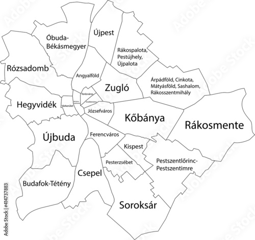 Simple white vector map with black borders and names of districts (kerület) of Budapest, Hungary
