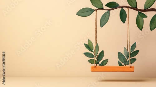 Simple Wooden Swing with Green Leaves Against Beige Wall