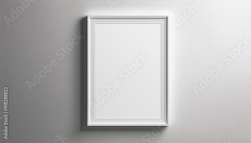 Single blank picture frame on a white wall with soft shadows and light rays, 3d render.