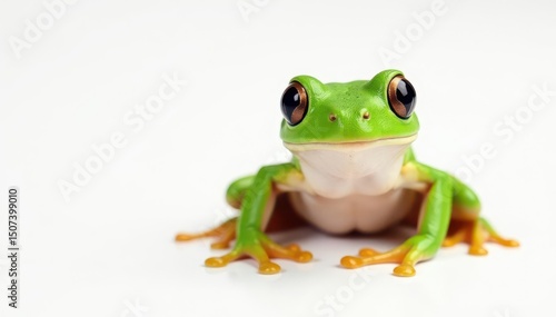 Single bright green frog on pure white backdrop, macro, studio shot, nature