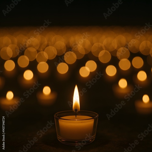 Single Candle in Focus with Dreamy Golden Bokeh Lights, Symbolizing Hope, Remembrance, Resilience, and Serenity at Night