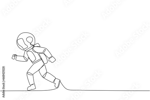 Single continuous line drawing astronaut doing light exercise. Running aims to maintain heart health. Astronaut with healthy life style. Good mental. Spaceman. One line design vector illustration