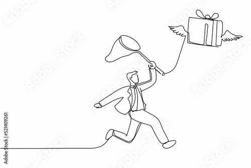 Single continuous line drawing businessman try to catching flying gift box with butterfly net. Winged gift symbol, transportation, fast delivery, box, package. One line draw design vector illustration
