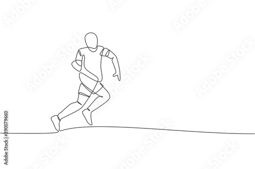 Single continuous line drawing of young agile rugby player running to catch the ball. Competitive sport concept. Trendy one line draw design vector illustration for rugby tournament promotion media