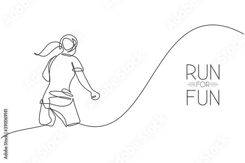Single continuous line drawing young agile woman runner hobby to run relax, rear view . Healthy sport action concept. Trendy one line draw graphic design vector illustration for running race promotion