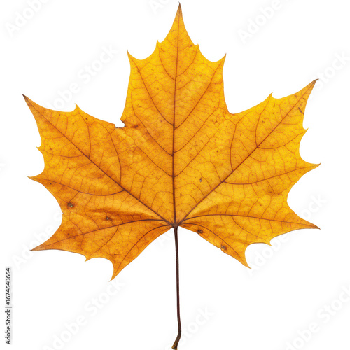 Single dried autumn maple leaf, vibrant golden yellow and deep orange, intricate veins in sharp focus, short petiole, isolated on transparent studio background, overhead shot, bright shadowless light,