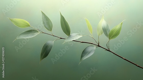Single elegant bamboo branch with delicate green leaves isolated on a plain neutral background in soft natural lighting The image conveys a sense of tranquility simplicity