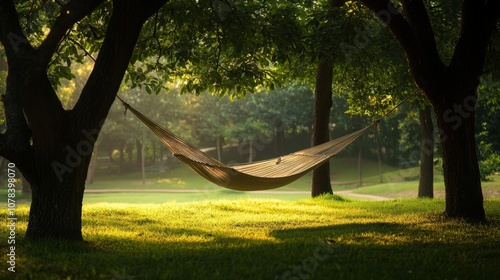 single empty hammock hanging between two trees in a quiet park soft evening light minimalist style high-resolution perfect for travel blogs and relaxation-themed content