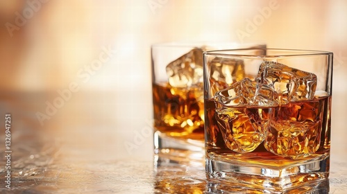 Single glass of fine whiskey perfectly poured for tasting session with ample copy space for text