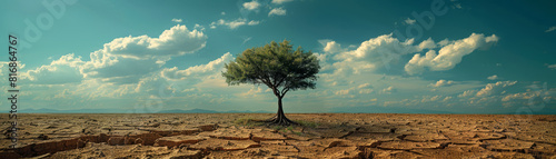 Single green tree stands resilient amidst a vast cracked earth terrain under a sky with fluffy clouds, depicting drought and hope.