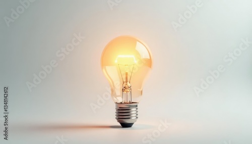 Single lightbulb glowing against stark white background, focus, science, minimal