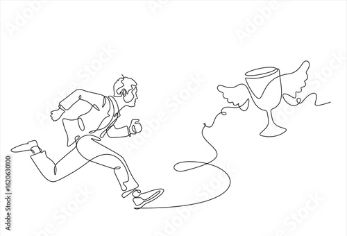 Single one line drawing businessman trying to catch trophy. Man running and chasing after fly away winner cup. Business challenge metaphor. Hand drawn one line vector. Editable stroke