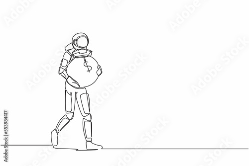 Single one line drawing of astronaut walking and carrying heavy money bag. Funding for future space technology development. Cosmic galaxy space. Continuous line draw graphic design vector illustration